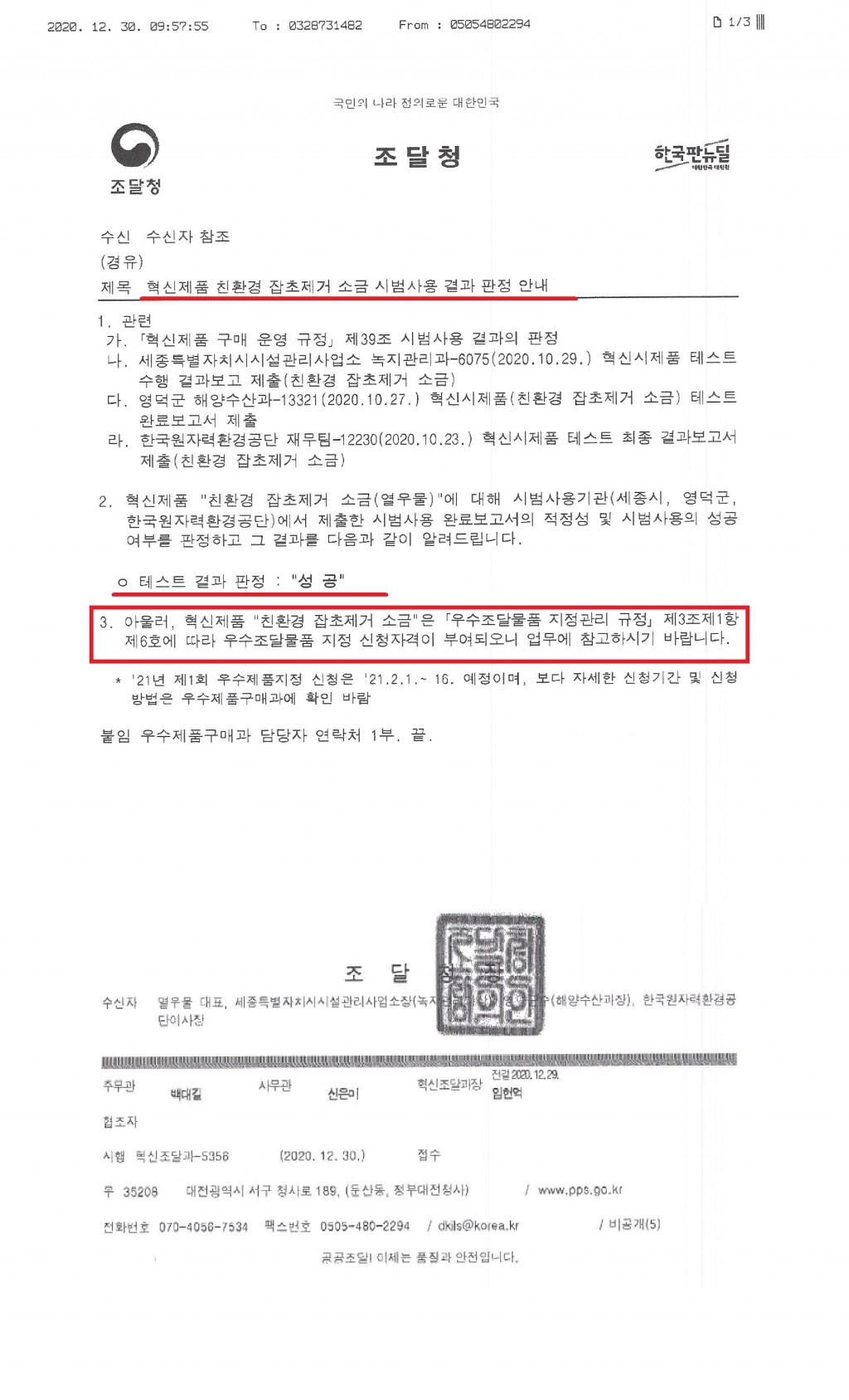 [공문]조달청 혁신제품 열우물 친환경잡초제거소금 테스트 "성공"