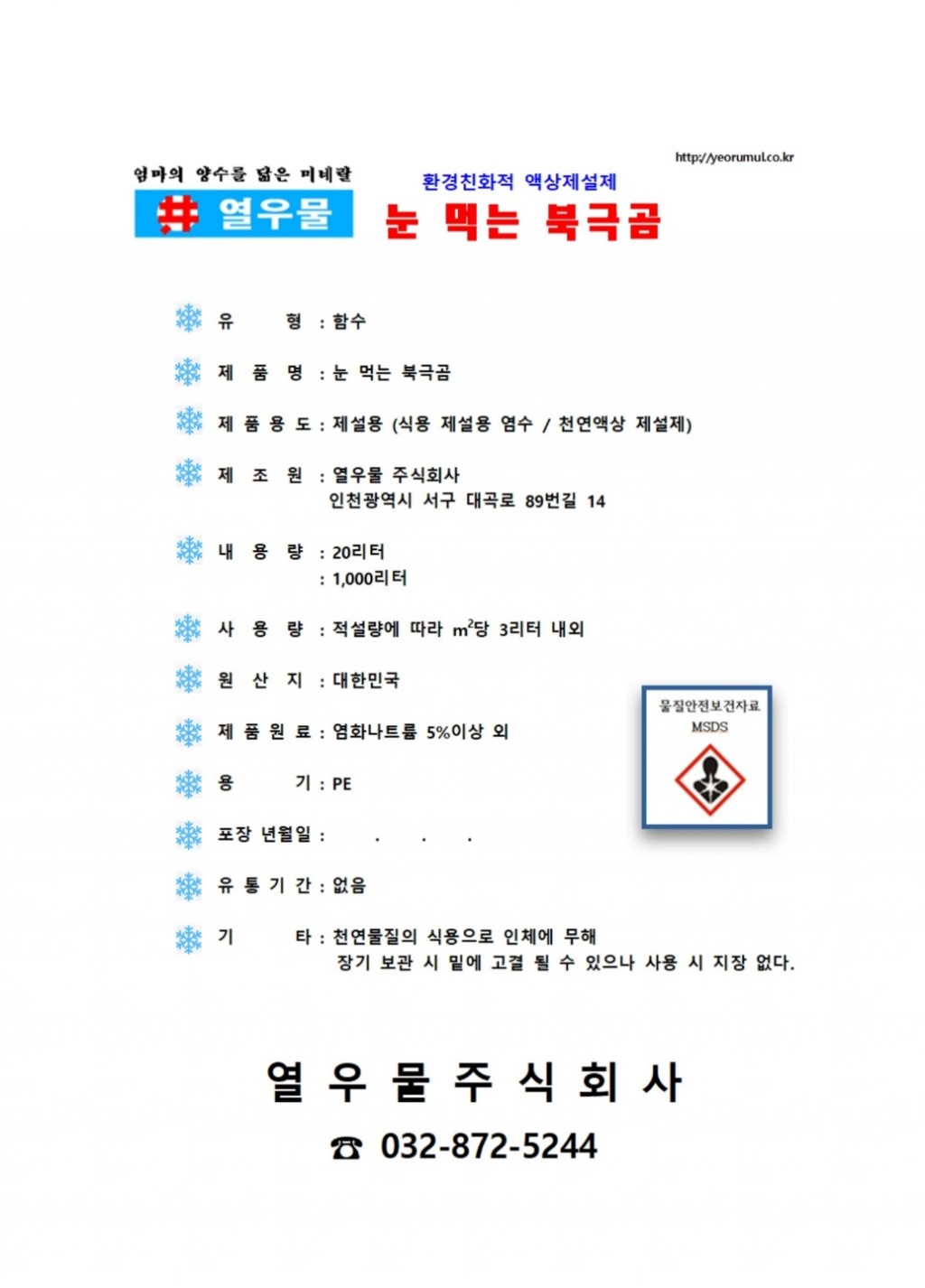 열우물 주식회사 식용액상제설제 식용제설용염수 눈먹는북극곰 식용제설용소금 : 네이버 블로그 (naver.com)